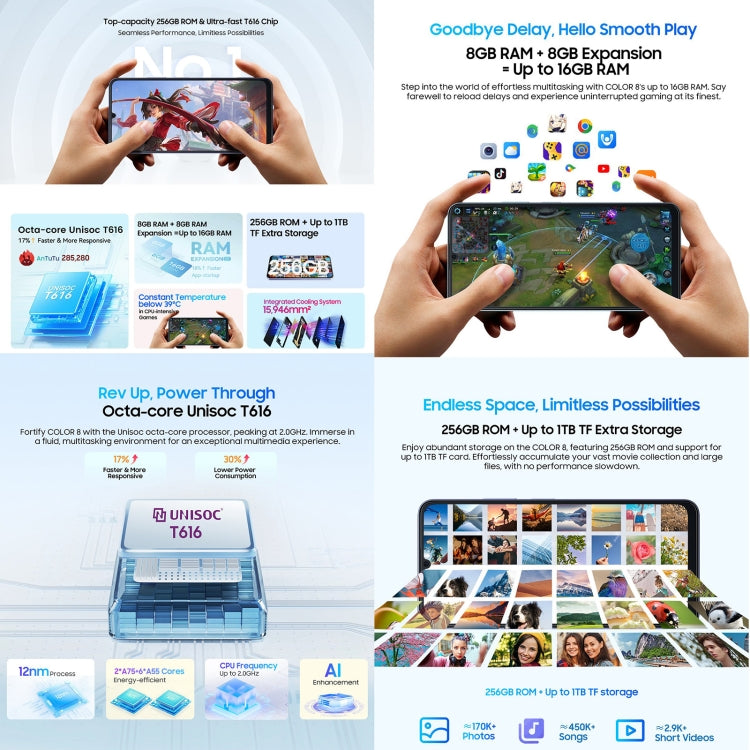 1. CPU: Unisoc T616 12 nm, octa núcleo