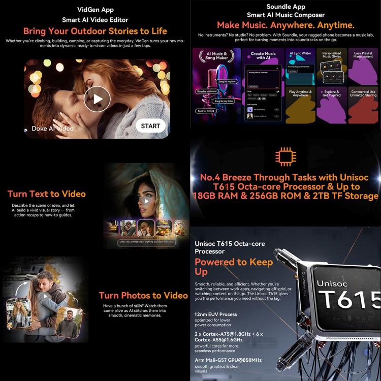 1. CPU: Unisoc UMS9230E T615, ocho núcleos, 2 x A75 1,8 GHz + 6 x A55 1,6 GHz;GPU: ARM Mali-G57 core 850MHz