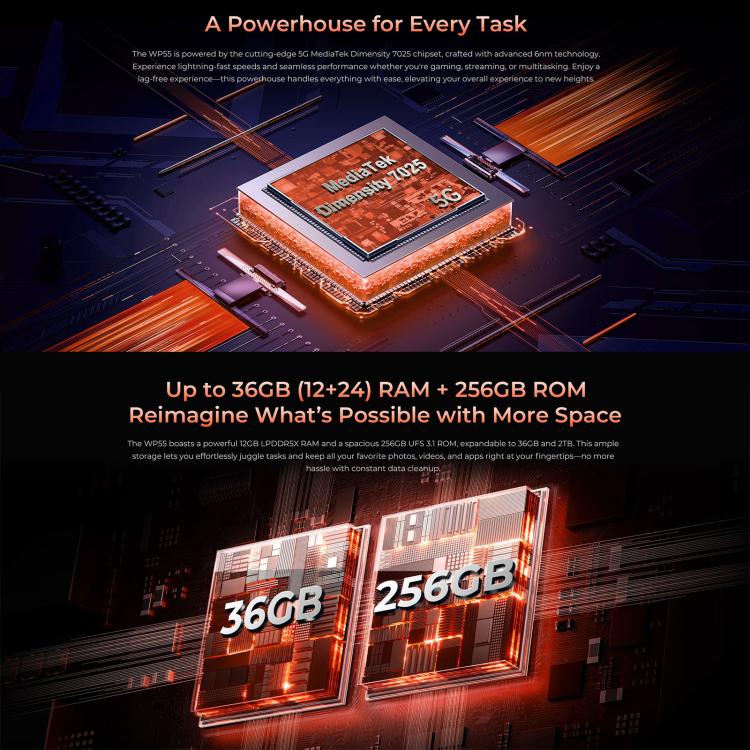 The Oukitel WP55 5G Rugged Smartphone is a heavy‑duty, performance‑focused device designed for outdoor professionals, adventurers, and power users who need reliable connectivity and extreme battery life. Combining a MediaTek Dimensity 7025 octa‑core processor, 12GB RAM (with 24GB virtual extension) and 256GB storage, this durable handset delivers smooth multitasking, fast 5G speeds and long‑lasting operation thanks to an enormous 11000mAh battery—ideal for field work, travel and extended use without frequent charging.