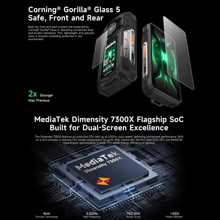 The Ulefone Armor 33 Pro Rugged Smartphone 16GB+512GB is a heavy-duty 5G device built for professionals, adventurers, and field workers who demand durability and top-tier performance. Combining a MediaTek Dimensity 7300X processor, massive 16GB LPDDR5 + 16GB dynamic RAM and 512GB UFS3.1 storage, this rugged phone delivers fast multitasking, ample storage, and reliable connectivity while surviving harsh environments with IP68/IP69K and MIL-STD-810H protection.