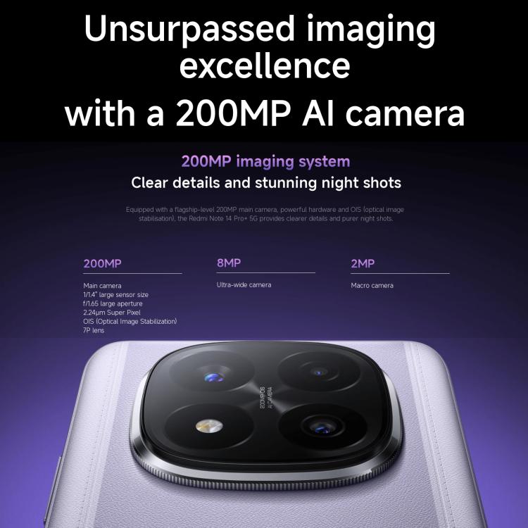 The Xiaomi Redmi Note 14 Pro+ 5G smartphone is a premium mid‑range device designed for power users and mobile photographers who demand flagship features without the flagship price. With a Snapdragon 7s Gen 3 processor, generous 12GB RAM and 512GB storage, plus a 6.67" CrystalRes AMOLED display, it delivers fast performance, vivid visuals and expansive storage for apps, games and media. Ideal for multitaskers, content creators and travelers seeking long battery life and advanced camera capabilities.